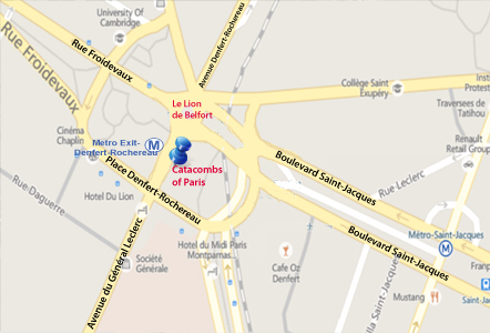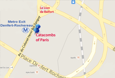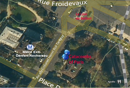 Conclusion Point: When the tour inside the Catacombs is complete the guide will walk the group out to the main road to 64 Avenue du Général Leclerc, at the intersection of Ave. du Général Leclerc and Rue Remy Dumoncel. The nearest metro stops are Mouton-Duvernet and Alesia.